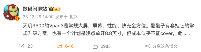 据数码闲聊站爆料:iQOO开了一款8.8英寸的高性能旗舰平板,原计划在明年第二季度推出,但成本似乎不能cover,危……(个人角度来说还是希望能看到更多小尺寸高性能平板落地,不然市场选择还是太少了)