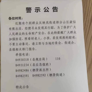 公告具体内容为:近期有个别群众反映我街道部分山区疑似有熊出没,经搜寻未发现其行踪,为了保护广大人民群众的生命财产安全,在此特提醒广大群众加强防范,照看好老人、小孩。若发现熊的踪迹,不要主动靠近,请立即与当地村委会、街道办、县级相关部门报告。