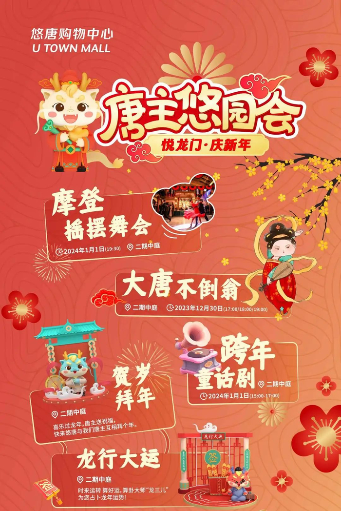 弄潮儿们不能错过朝外大街的悠唐购物中心。“惊喜跨年趴”上,国潮快闪巡游、热力舞蹈秀、跨年乐队表演给您无限惊喜呀!国潮来袭,唐主悠园会上设立了大唐不倒翁、龙行大运等趣味活动,营造欢乐节日氛围。1月1日15:00-17:00,悠唐将上演跨年童话剧,来看一场可爱又活力满满的表演吧。1月1日18: 00-19:00,来参加“摩登摇摆舞会”,一起跟随音乐舞动起来!