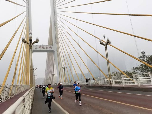 跑友在嘉陵江上中坝大桥上奔跑。(摄影:李兴罡)