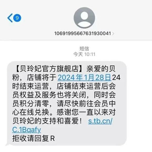 这几天,有不少网友发帖,表示收到了来自贝玲妃官方旗舰店的信息:贝玲妃官方旗舰店将于2024年1月28日关闭。
