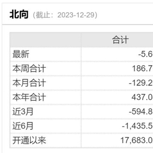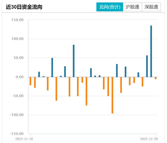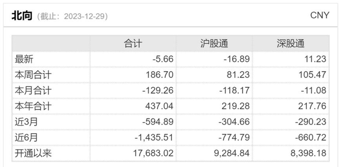 Wind数据显示,北向资金周五全天净卖出5.66亿元。本周,北向资金合计净买入186.7亿元(本周仅有周三至周五合计三天北向资金进行交易)。12月,北向资金累计减仓近130亿元。回顾2023年,北向资金在1月一度猛烈加仓超过1400亿元,年内买卖总额达25万亿元,累计净买入437亿元,为2014年以来连续十年净买入。
