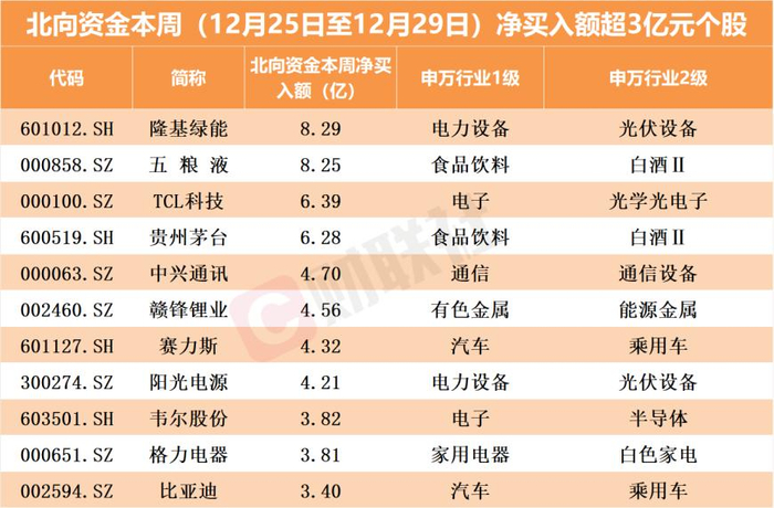 从周度(12月25日至29日)表现看,北向资金周净买额累计超3亿元的个股见下表。其中,“光伏茅”隆基绿能、五粮液加仓均超8亿元,TCL科技、贵州茅台净买入额均超6亿元。