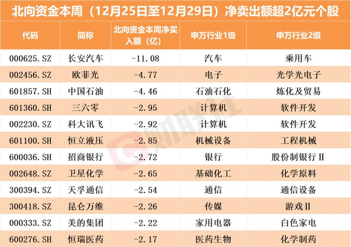 卖出方面,本周北向资金净卖出超2亿元的个股如下表。具体来看,长安汽车减仓11.08亿元,欧菲光、中国石油净卖出均超4亿元。