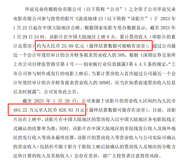 上半年的电影市场,华谊并无太多亮眼的表现,也未参与《消失的她》《孤注一掷》等大爆项目。如上文提及,华谊只是《流浪地球2》的参投方。据其1月末发布的公告,截至1月29日,公司来源于该影片的营业收入区间约为484.22万元至628.93万元。照此比例估算,华谊兄弟最终从该项目获得的营收大概在1000万元左右。