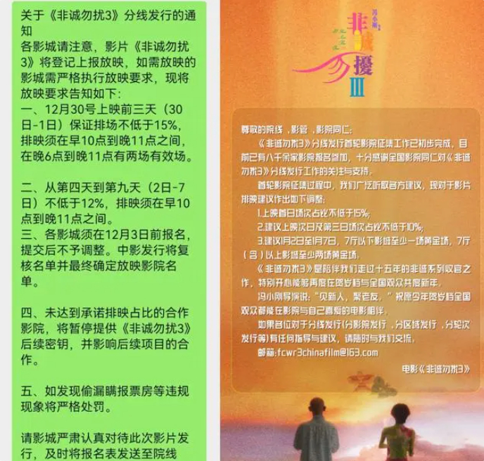 若截图内容属实,《非诚勿扰3》或有滥用影片影响力的嫌疑,这无疑违背分线发行“市场主导、灵活协商”的初衷。此外,今年贺岁档新片体量多于往年,又有现象级黑马《一闪一闪亮星星》(华谊参投)、大牌云集的《金手指》《潜行》等同台竞技。在影片质量未明前指定“硬性排片要求”,对影院而言是一种冒险。