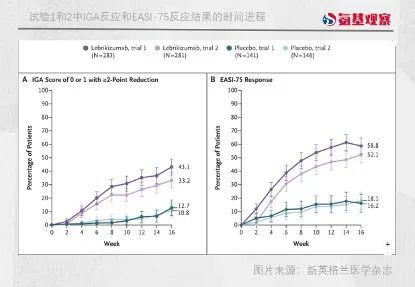2023年,礼来在《新英格兰医学杂志》上公布了IL-13单抗lebrikizumab治疗中重度皮炎的两项三期临床试验。结果显示,在两项试验中接受lebrikizumab治疗一年的患者,达到IGA0/1的比例分别为43.1%、33.2%,而在安慰剂中这一数字分别为12.7%、10.8%。