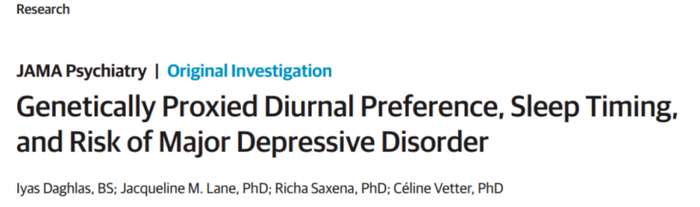 ②Daghlas I, Lane JM, Saxena R, Vetter C. Genetically ProxiedDiurnal Preference, Sleep Timing, and Risk of Major Depressive Disorder. JAMA Psychiatry. 2021 Aug 1;78(8):903-910. doi: 10.1001/jamapsychiatry.2021.0959. PMID: 34037671; PMCID: PMC8156187.