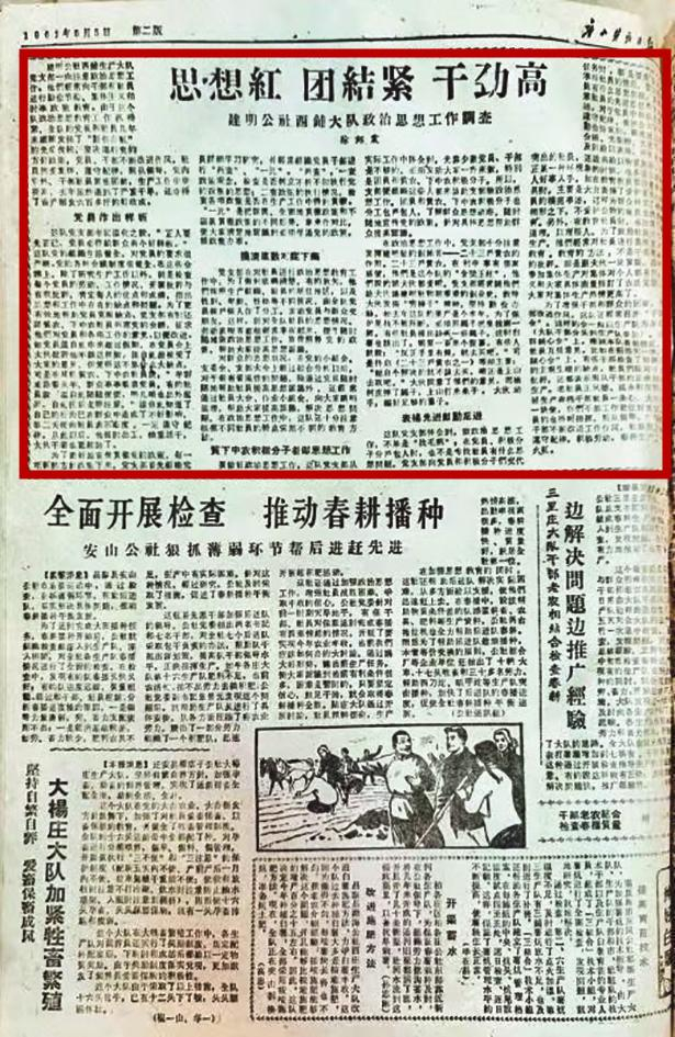 1961年5月5日,《唐山劳动日报》刊登了徐绍震关于西铺思想政治工作的调查《思想红 团结紧 干劲高》。
