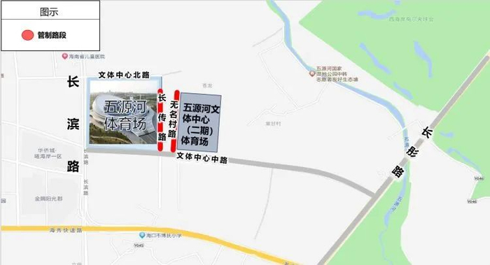 注:2023年12月31日22:30至2024年1月1日00:20时间段无人机表演期间将对长传路(文体中心中路口至体育场D口处)、五源河二期体育馆西侧无名村路(文体中心延长线路口至无名村路第一个丁字路口)实施禁止通行交通管制。