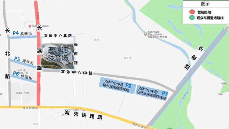 P2:文体中心中路延长线南侧停车场(约900个停车位);P3:文体中心中路东桥头东南侧停车场(约1000个停车位);美新街(P4)、博养街(P5)、仲韶街 (P6)等周边路段在演唱会期间可临时停放,约2000个车位;P7:长彤路东西半幅辅道停车区域(约400个车位);P8:海南国际会展中心(含南北广场及21号路,约800个地面车位)。