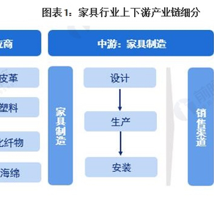 从产业链条来看,在上游核心原料的供应阶段主要包括木材、皮革、弹簧、玻璃、金属、塑料、化纤、海绵等。中游即家具制造,主要包括家具的设计、生产、安装等。下游消费市场按行业可以分为零售业、家具装饰装修行业,按消费渠道可以分为线上渠道、线下渠道。