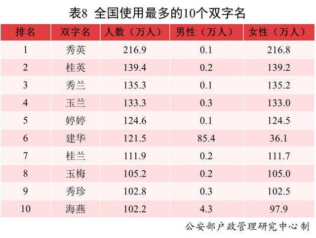 使用频率最高的10个单字名