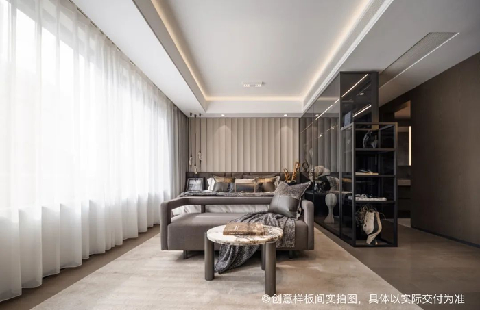 卧室部分,主卧面宽达到约5.1m——这是什么概念呢?足够大的进深尺度,让主卧体系打破了传统衣帽间、床、床头柜的老三样布置。在摆放下一张2.2m的大床之外,还可摆放一个沙发和梳妆台,让“主卧小家化”。不仅可以直接对标市面上建面约180㎡产品,夫妻俩还得以在此聊聊工作,聊聊生活。越秀·天悦云萃赋予了这一空间一个浪漫的名字——“恋人主卧”。
