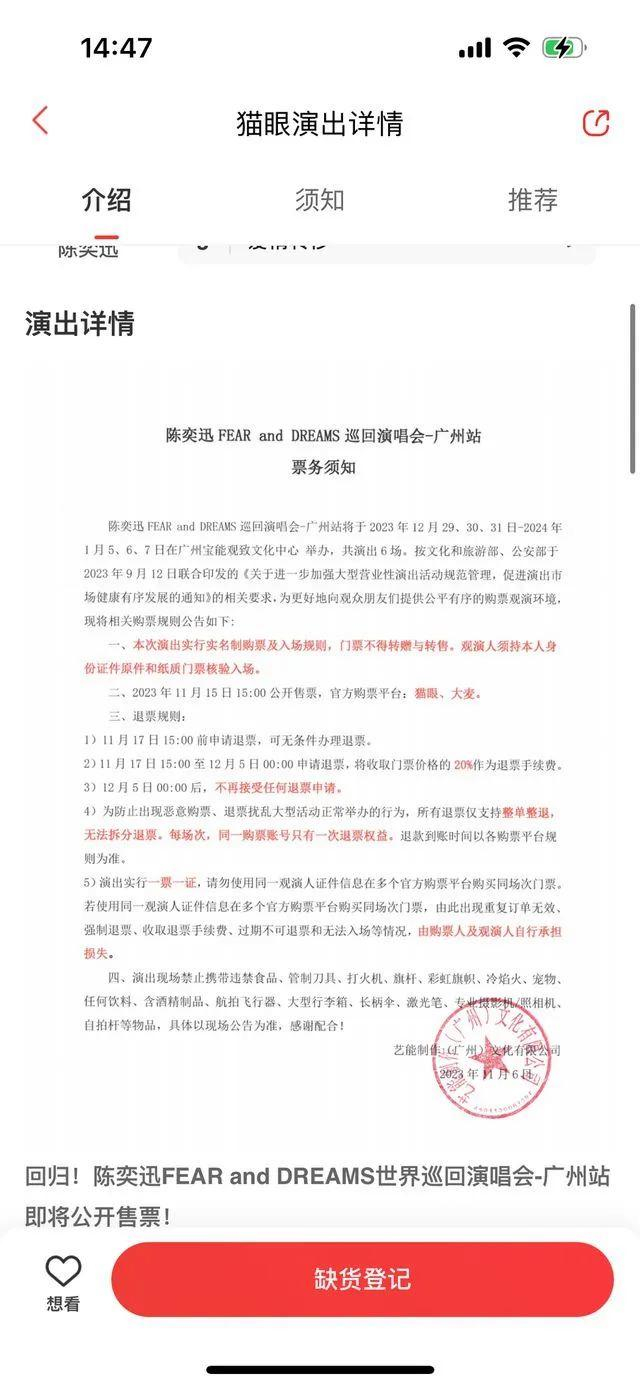 公开信息显示,此次陈奕迅“FEAR and DREAMS”世界巡回演唱会广州站将于2023年12月29、30、31日和2024年1月5、6、7日举办,共计演出6场,主办方为艺能制作(广州)文化有限公司。