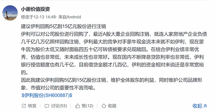 雪球用户“小谢价值投资”就认为,伊利应该再拿出5亿到15亿回购注销自己的股份。“最近A股大量企业回购注销,就连房地产企业也照样回购注销。结合伊利业绩非常优秀,估值也非常低,未来成长性也非常好。现在国内不断降息贷款利率也非常低,伊利的资金相对来说还是非常宽裕的。市值对公司的重要性不言而喻。”“周阆令”也表示,“即使资本开支过大,也可以通过其他措施增加现金流,从而回购股份。伊利接下来是有可能进行股份回购并注销的。”