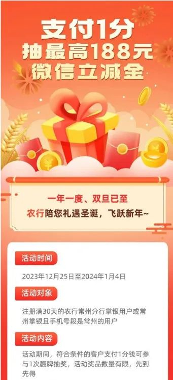 值得一提的是,也有银行专注特定区域推出相应假期优惠活动。农业银行常州分行推出“支付1分抽最高188元微信立减金”活动。2023年12月25日至2024年1月4日,注册满30天的农行常州分行掌银用户或常州掌银且手机号段是常州的用户,可参与1次翻牌抽奖活动,最高可抽到188元立减金。