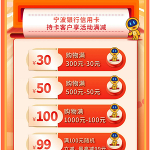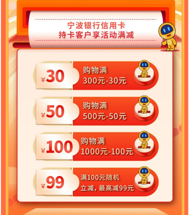 以宁波银行为例,该行联合湖城各大商圈广场,如星火百货、浙北购物中心、万达广场、首创奥特莱斯等重磅推出商圈活动。2023年12月30日至2024年1月1日,宁波银行信用卡持卡客户享有满减优惠,满300元减30元、满500元减50元、满1000元减100元,此外,满100元还有随机立减,最高可以立减99元。新客户还有别的优惠权益。