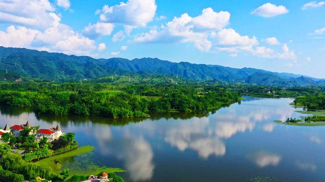 6月25日,梁平区双桂湖国家湿地公园,蓝天白云倒映在湖泊里,与湿地、城市交相辉映,构成一幅湿地美、生态靓的美丽画卷。