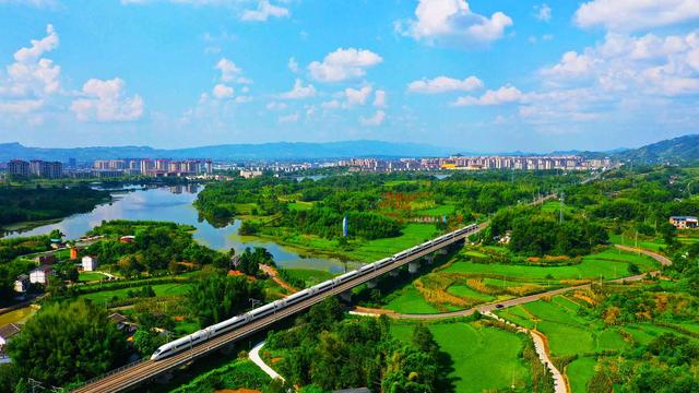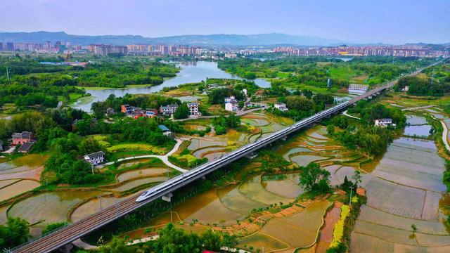5月1日,梁平区双桂湖国家湿地公园,一辆郑渝高速列车从成片的稻田湿地中穿行而过,与梁平双桂新城形成一幅绿意盎然的美丽画卷。