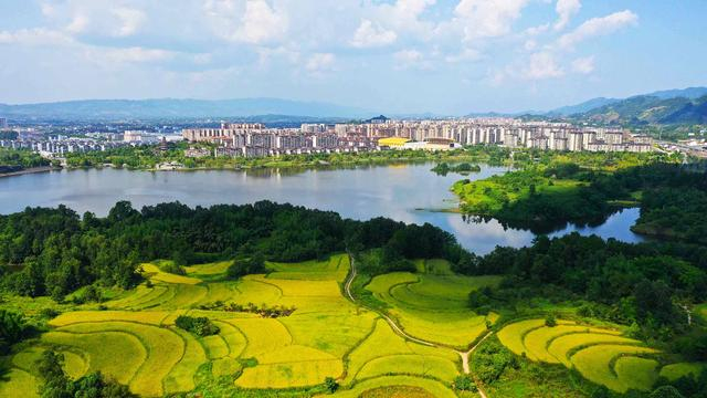 8月22日,梁平区双桂湖国家湿地公园,金黄色的稻田湿地与城市相互映衬,美景如画。
