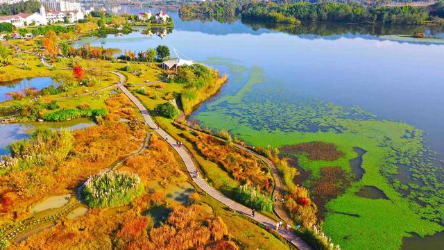10月13日,梁平区双桂湖国家湿地公园,蓝天白云倒映在湖泊中,城市、湖泊、湿地、森林融为一体,呈现出一幅美丽的画卷。