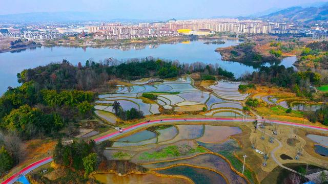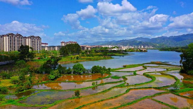 4月6日,梁平区双桂湖国家湿地公园,蓝天白云倒映在稻田湿地里,与湖泊、城市交相辉映,构成一幅湿地美、生态靓的和谐美景。