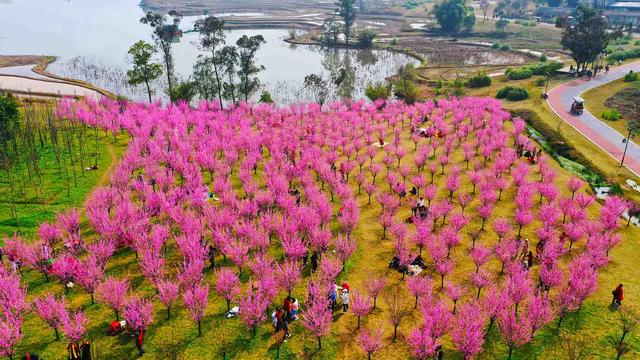 3月8日,梁平区双桂湖国家湿地公园,游客在梅花园中游玩。