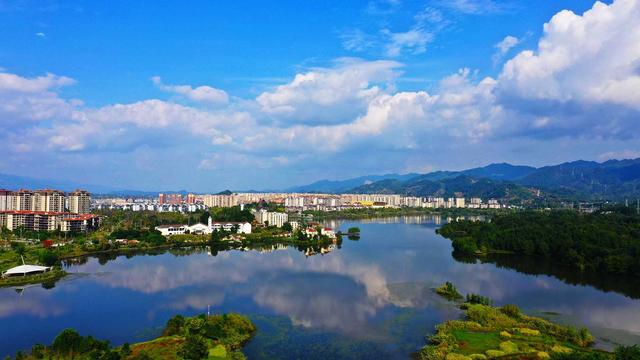 8月30日,梁平区双桂湖国家湿地公园,蓝天白云倒映在湖泊里,与城市、绿地交相辉映,构成一幅美丽的绿色生态画卷。