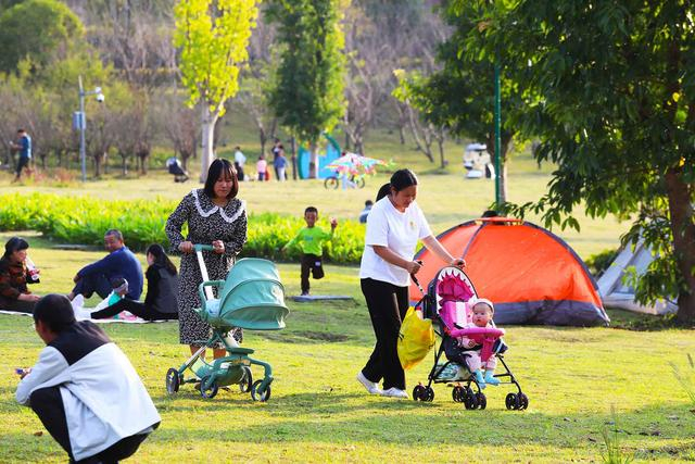 10月22日,梁平区双桂湖国家湿地公园,市民推着婴儿车享受着秋日暖阳。