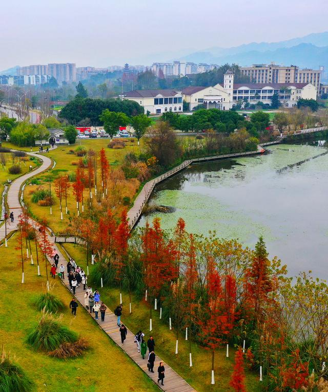 11月26日,梁平区双桂湖国家湿地公园都梁飞雪景点,水杉树的树叶变成深红,色彩斑斓,冬景如画,市民们在游玩打卡,享受冬日暖阳的美好时光。