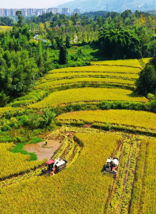 9月3日,梁平区双桂湖国家湿地公园南岸,收割机在稻田中收割绿色水稻。
