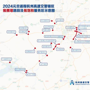 值得注意的是,元旦假期返程期间,各服务区易出现车辆饱和状态,特别是G56杭瑞高速杭州方向龙岗服务区,G60杭金衢高速萧山服务区,S14杭长宜高速径山服务区,S43杭州绕城西复线高速富阳服务区,G25长深高速杭州方向桐庐服务区,G2504杭州绕城高速下沙服务区,G4012溧宁高速千岛湖停车区,S29临建高速瑶琳服务区、於潜服务区等受短期旅游自驾车辆出行剧增影响,容易饱和甚至出现排队倒灌至主线的现象,建议驾驶员提前加好油和电,早做休整。