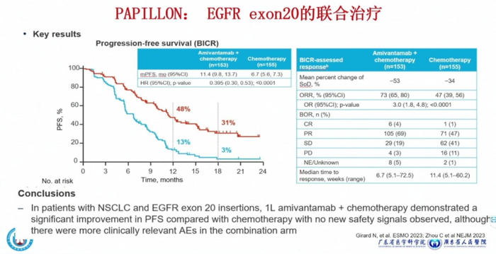 另一种联合治疗模式为“非你不可型”,这是基于单药疗效不足的情况下,选择联合用药来叠加疗效。其中,以PAPILLON研究为例,该研究结果显示,相比化疗,Amivantamab+化疗一线治疗EGFR20号外显子插入突变晚期NSCLC患者可以带来PFS延长,中位PFS为11.4个月和6.7个月(HR 0.395,P<0.0001)。
