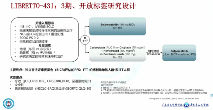 LIBRETTO-431是一项开放标签、随机对照的III期研究,旨在评估selpercatinib对晚期或转移性、未经治疗的RET融合阳性非小细胞肺癌患者的疗效。共计212例患者接受了随机分组,中期分析数据显示,selpercatinib组的中位PFS为24.8个月,对照组为11.2个月。selpercatinib组的客观缓解率为84%,对照组为65%。