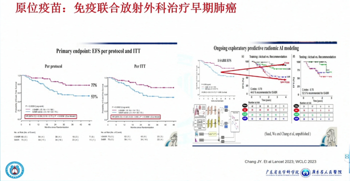 原位疫苗即I-SABR模式,基本思想是通过高剂量的放射疗法结合免疫治疗,不仅可以杀灭肿瘤细胞,还可以刺激免疫反应,从而达到“1+1>2”的效果,相关研究已经亮相于今年WCLC大会。