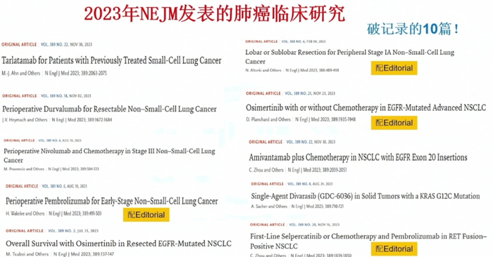 2023年,NEJM发布了10篇肺癌临床研究,包括围术期的ADAURA、AEGEAN、KEYNOTE-671、NADIM II研究,以及晚期肺癌的FLAURA2、Amivantamab、KRAS抑制剂、RET抑制剂等研究,同时在Lancet上也有4项肺癌重磅研究公布,可谓是肺癌领域“大丰收”的一年。