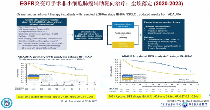 对于EGFR突变早中期可手术肺癌患者,自2020年至2023年,ADAURA研究接连更新了研究结果,而随着今年ASCO(美国临床肿瘤学会)大会上公布了总生存(OS)结果,奥希替尼辅助治疗的地位已毋庸置疑。这项研究纳入了IB-IIIA期可手术切除的EGFR突变非小细胞肺癌(NSCLC)患者,在接受化疗或不接受化疗后,随机分为接受奥希替尼或安慰剂进行辅助治疗。在2023年更新的无病生存期(DFS)数据显示,IB-IIIA期人群中奥希替尼组和安慰剂组的中位DFS分别为65.8个月和28.1个月(HR 0.27),两组的5年OS率为88%和78%(HR 0.49,P<0.0001)。