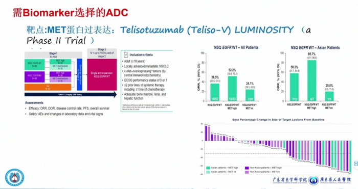 除此之外,针对蛋白表达的其他ADC药物探索也正在进行之中,主要包括针对MET蛋白过表达的Ⅱ期LUMINOSITY研究,中期分析数据显示,在接受Telisotumab治疗的EGFR-WT非鳞状NSCLC患者中,c-Met高表达组的ORR为53.8%,c-Met中等表达组的ORR为25.0%。