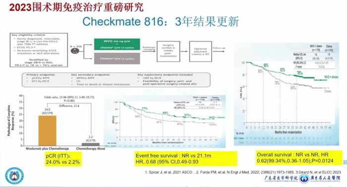 CheckMate-816研究纳入了IB-IIIA期可手术切除NSCLC患者,在术前随机接受纳武利尤单抗+化疗或化疗进行新辅助治疗,术后进行辅助化疗±放疗。该研究在今年公布了3年随访数据,免疫联合组与化疗组的病理学完全缓解(pCR)率为24.0%和2.2%,两组的中位无事件生存期(EFS)为未达到和21.1个月(HR 0.68,95%CI 0.49-0.93),中位OS均未达到(P=0.0124),3年OS率为78%和64%。吴一龙教授指出,“这项研究应该作为免疫围术期治疗的‘参照标杆’,我们需要思考未来能否用更少的治疗周期带来更佳的生存获益。”