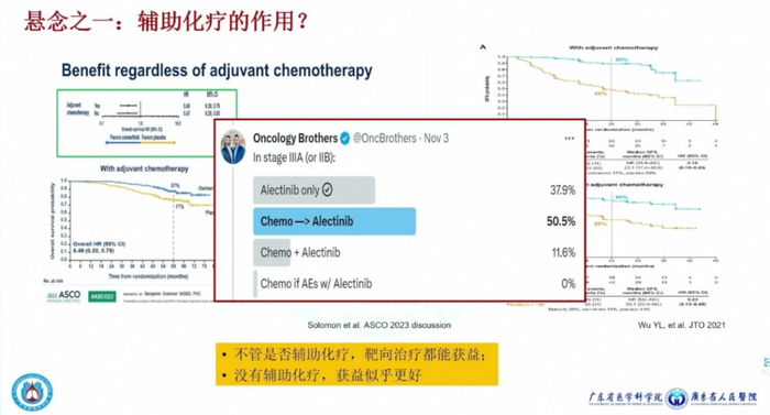 ALINA研究采用靶向与化疗头对头进行对比,而ADAURA研究则在化疗后再采用奥希替尼与安慰剂进行对比,两者研究设计中对化疗的定位有所不同。不过,两项研究均得出阳性结果,这意味着无论是否接受过辅助化疗,靶向治疗都能获益。从ADAURA亚组分析显示,未接收化疗的患者,获益似乎更好。吴一龙教授表示,在国外Oncology Brothers的一项调研显示,约一半的肿瘤医生选择化疗序贯阿来替尼的辅助治疗方式,只有三分之一医生支持阿来替尼单药,通过细分调研对象发现,支持阿来替尼单药的医生主要是外科,而内科更倾向联合用药。吴一龙教授点评道,“这可能与医生诊疗观念有关,即便ALINA研究提示无需化疗也能获益,但内科医生更难‘放弃’传统化疗,而外科医生喜欢更简便的用药方式。”