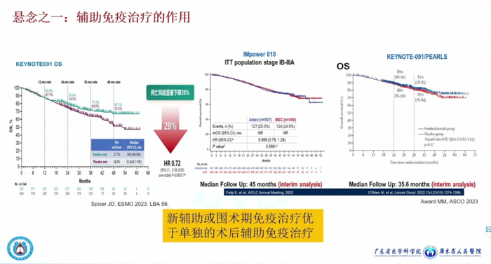 KEYNOTE-691、IMpower010、KEYNOTE-091/PEARLS研究结果发现,新辅助/围术期免疫治疗的疗效优于单独术后免疫辅助治疗,吴一龙教授指出,“这提示我们,对于能手术切除的患者,我们应该尽早让免疫治疗介入到治疗中。”
