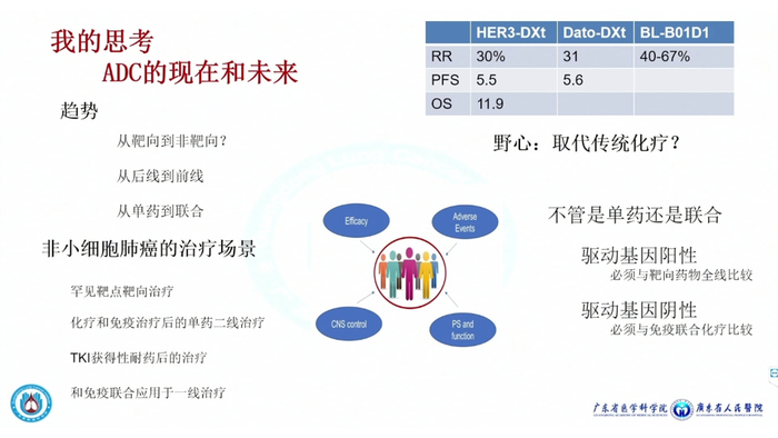 会上,吴一龙教授针对肺癌ADC药物的发展趋势做了总结。首先就是针对治疗靶点的选择方面,逐渐由追求靶向转为追求泛靶;其次就是研究重心逐渐从后线治疗逐步转向一线治疗方案;再次就是从单药疗效及安全性的探索逐步转向药物或疗法的联合;最后就是针对药物最佳剂量以及药物独特副作用的分析与研究。