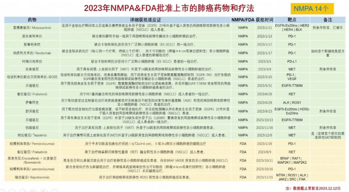 在肺癌新适应证方面,截至2023年12月12日中国国家药品监督管理局(NMPA)一共批准了14个新适应证,包括5个免疫治疗和9个靶向治疗适应证;美国食品药品监督管理局(FDA)则批准了5个肺癌适应证。