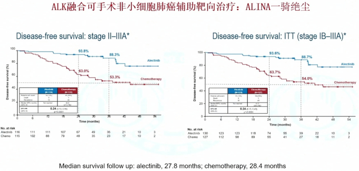 在ALK领域,ALINA III期研究纳入了IB-IIIA期可手术切除的ALK+NSCLC患者,随机分为阿来替尼或化疗组。结果显示,无论是II-IIIA期或IB-IIIA期人群中,阿来替尼均可显著延长中位DFS,HR均为0.24(P<0.0001)。