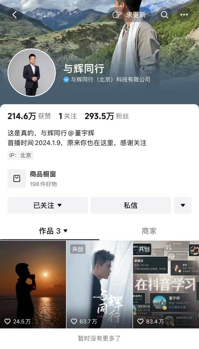 2023年12月30日,董宇辉的新账号“与辉同行”也官宣了首播时间为2024年1月9日。该账号企业认证为与辉同行(北京)科技有限公司。截至发稿,该账号已经超过290万粉丝关注。