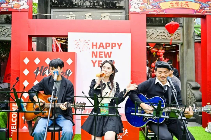 在西天庙音乐会现场,市民游客感受音乐魅力的同时,还走进西天庙,在崭新的竖幅上写下对新年的满满祝福。据了解,本次西天庙新年音乐会将于2024年1月1日15:00-17:00继续上演。将现代的音乐、传统的祈福方式和本地美食结合起来,为市民游客提供一个体验本地文化和美食的场所。