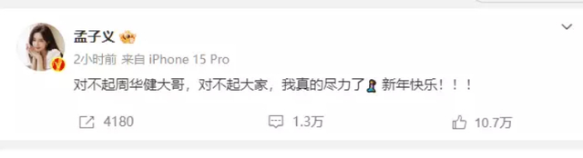 据悉,当晚周华健和颜人中、孟子义、刘令姿、曾可妮、李好、刘维合唱歌曲《让我欢喜让我忧》,合唱中,孟子义的音调与其他人差别巨大,甚至可以在众人的大合唱中明显凸显出来。当天晚间,孟子义在社交平台上发文回应道:“对不起周华健大哥,对不起大家,我真的尽力了,新年快乐!”