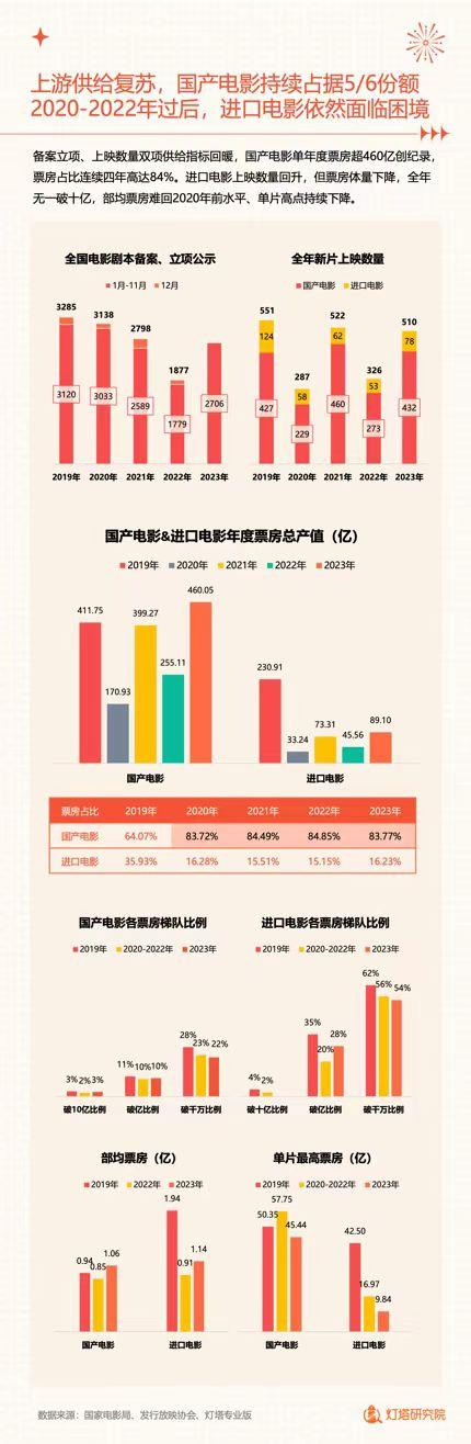 报告显示,2023年备案立项、上映数量双项供给指标回暖,国产电影单年度票房超460亿创纪录,票房占比连续四年高达84%。进口电影上映数量回升,但票房体量下降,全年无一破十亿,部均票房难回2020年前水平、单片高点持续下降。