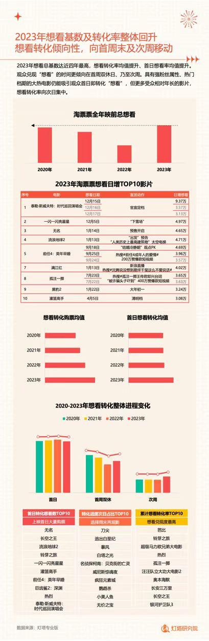 此外,2023年想看总基数达近四年最高,想看转化率均值提升、首日想看率均值提升。观众兑现“想看”的时间更倾向在首周双休日、乃至次周。具有强粉丝属性、热门档期的大热电影仍能吸引观众首日即转化“想看”,但更多受众相对年长的影片,想看转化率向次日集中。